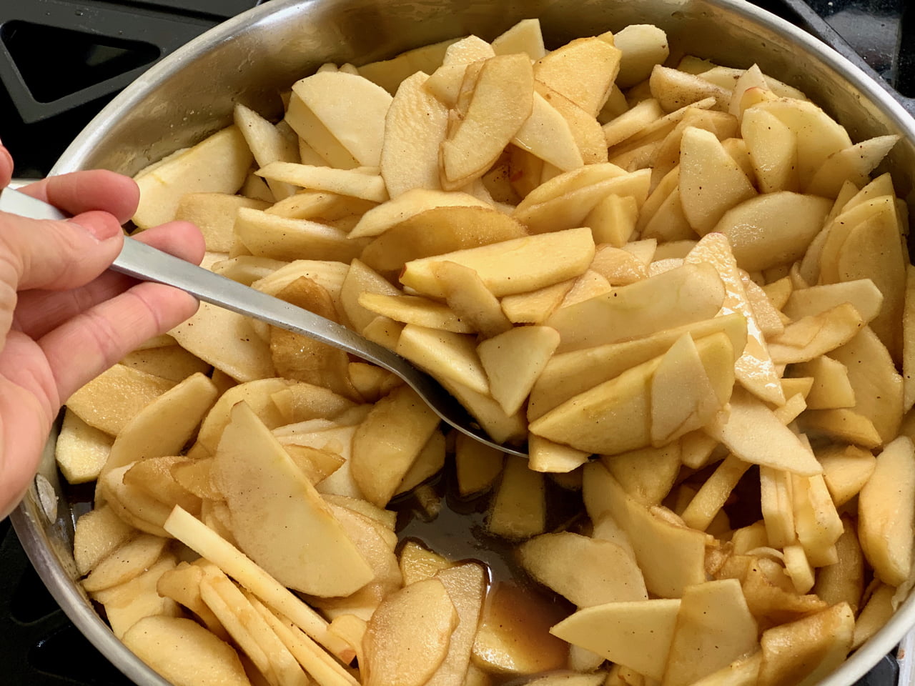 - In a large frying pan with a lid, melt butter with olive oil. Add the apples, lemon juice, sugar, and spices. Toss well and cook covered on medium for about 10 minutes. Remove cover and lower a bit to cook another 5 minutes, tossing occasionally. Turn off.