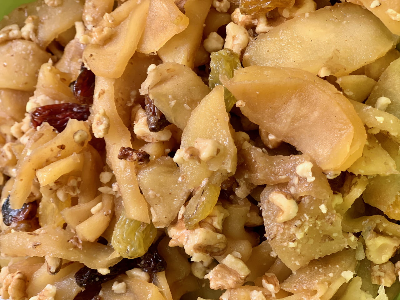- With a slotted spoon remove all the apples into a mixing bowl. Add nuts, raisins and lemon zest, toss and set aside.