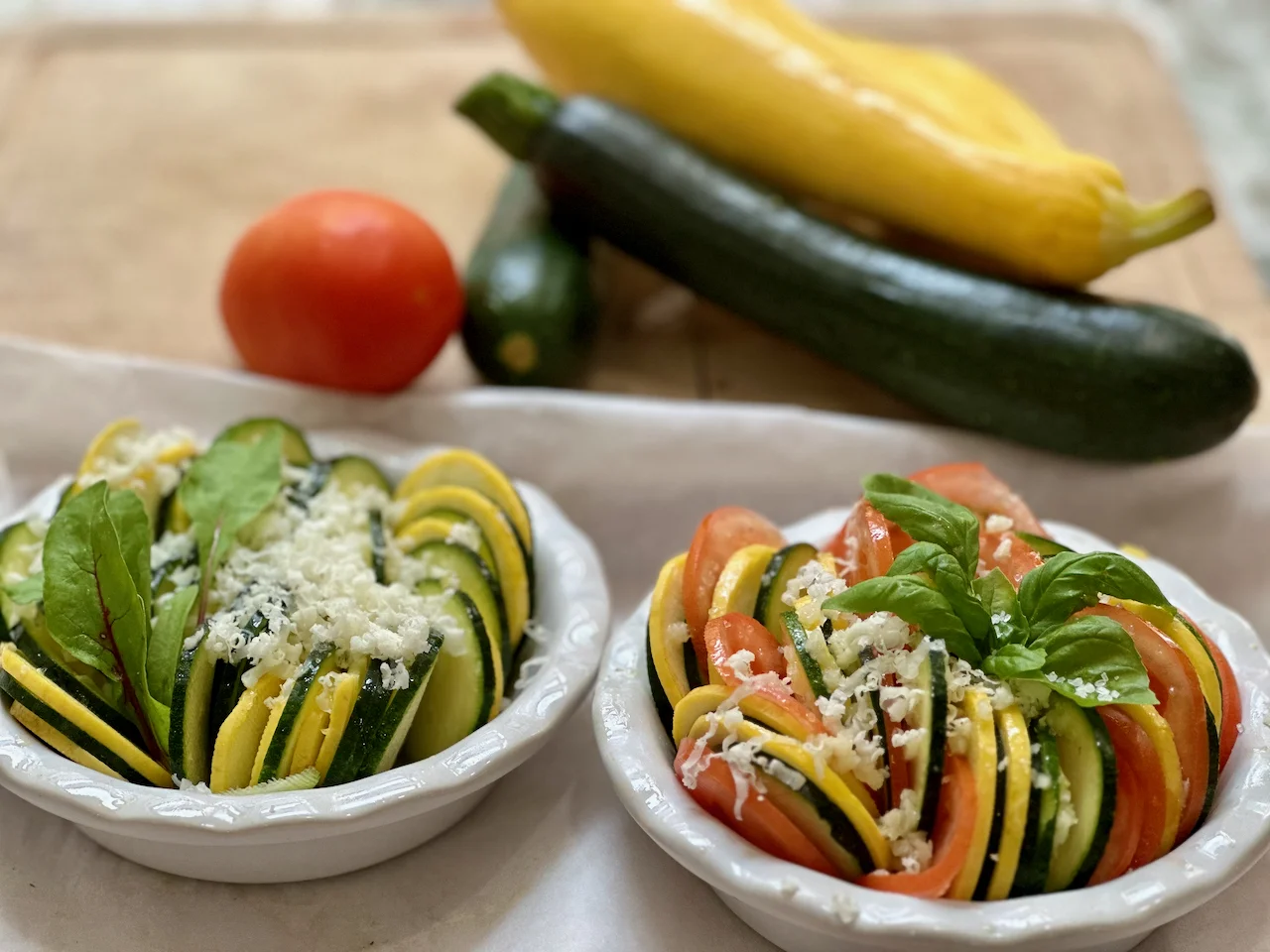 Step 2: Slice vegetables thinly – Using a mandoline or sharp knife, slice zucchini, yellow squash, and tomatoes into thin, even rounds (about â…› inch thick). Uniform slices are essential for even baking.